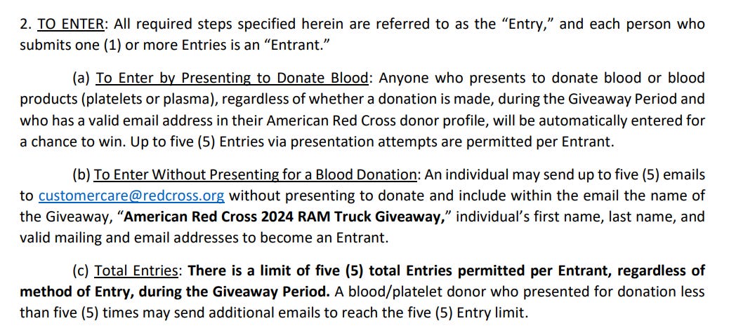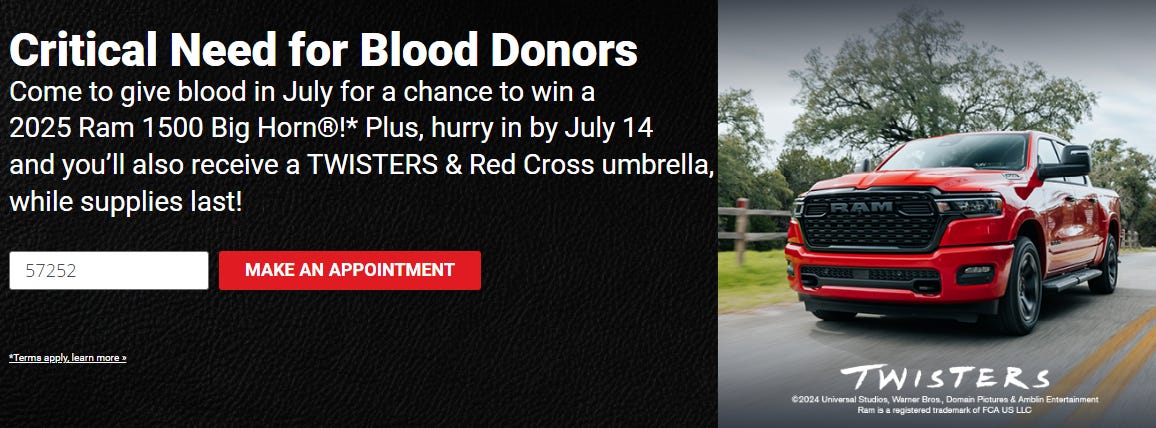 The next day, yesterday, at work I found an announcement from The Red Cross. They were looking for blood donations. And they’re giving away a 2025 RAM truck. And I started thinking about how it would be nice to use the law of attraction to win it.